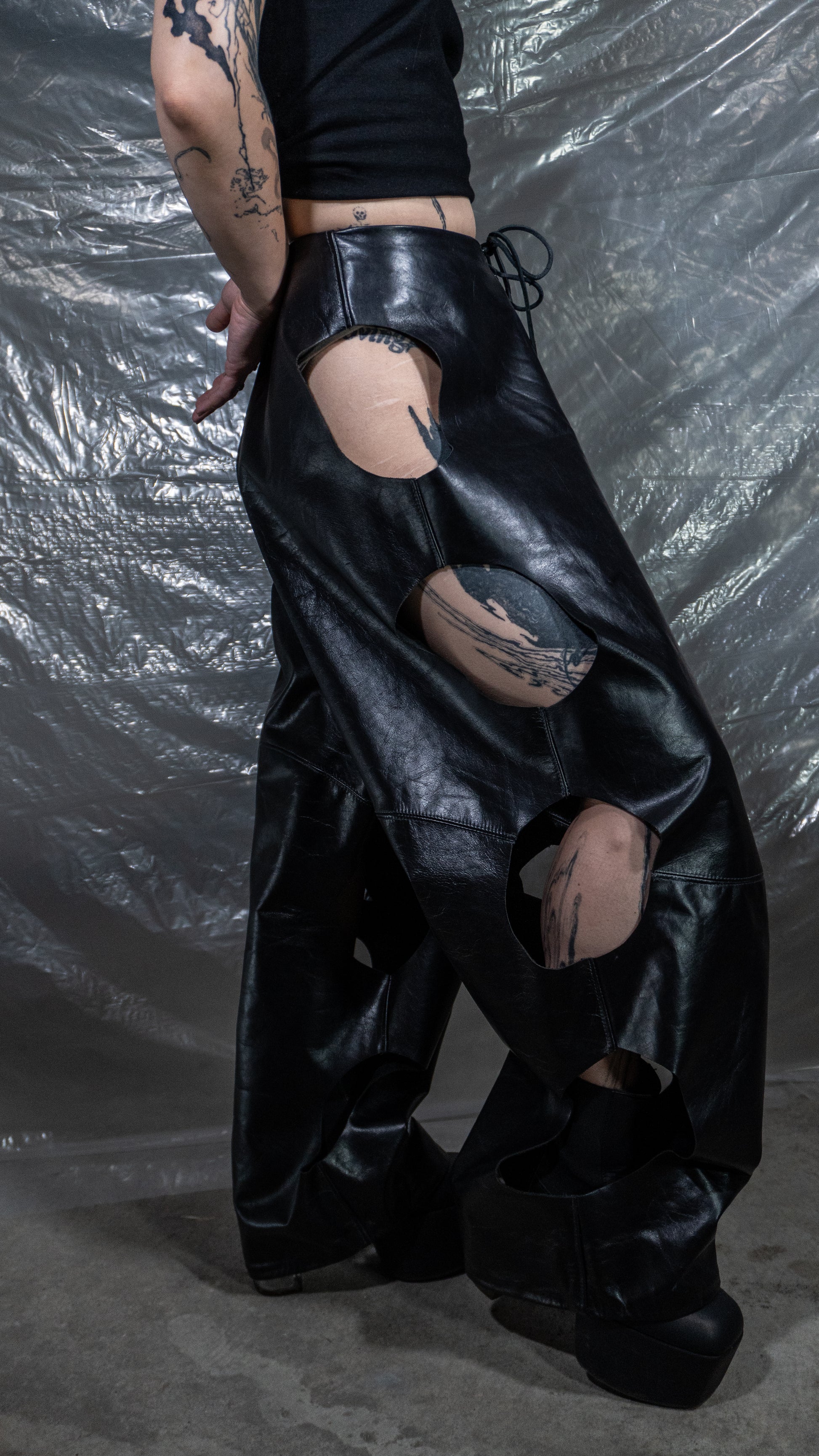Trouser fit with a wide leg. 100% real cow leather, unlined.